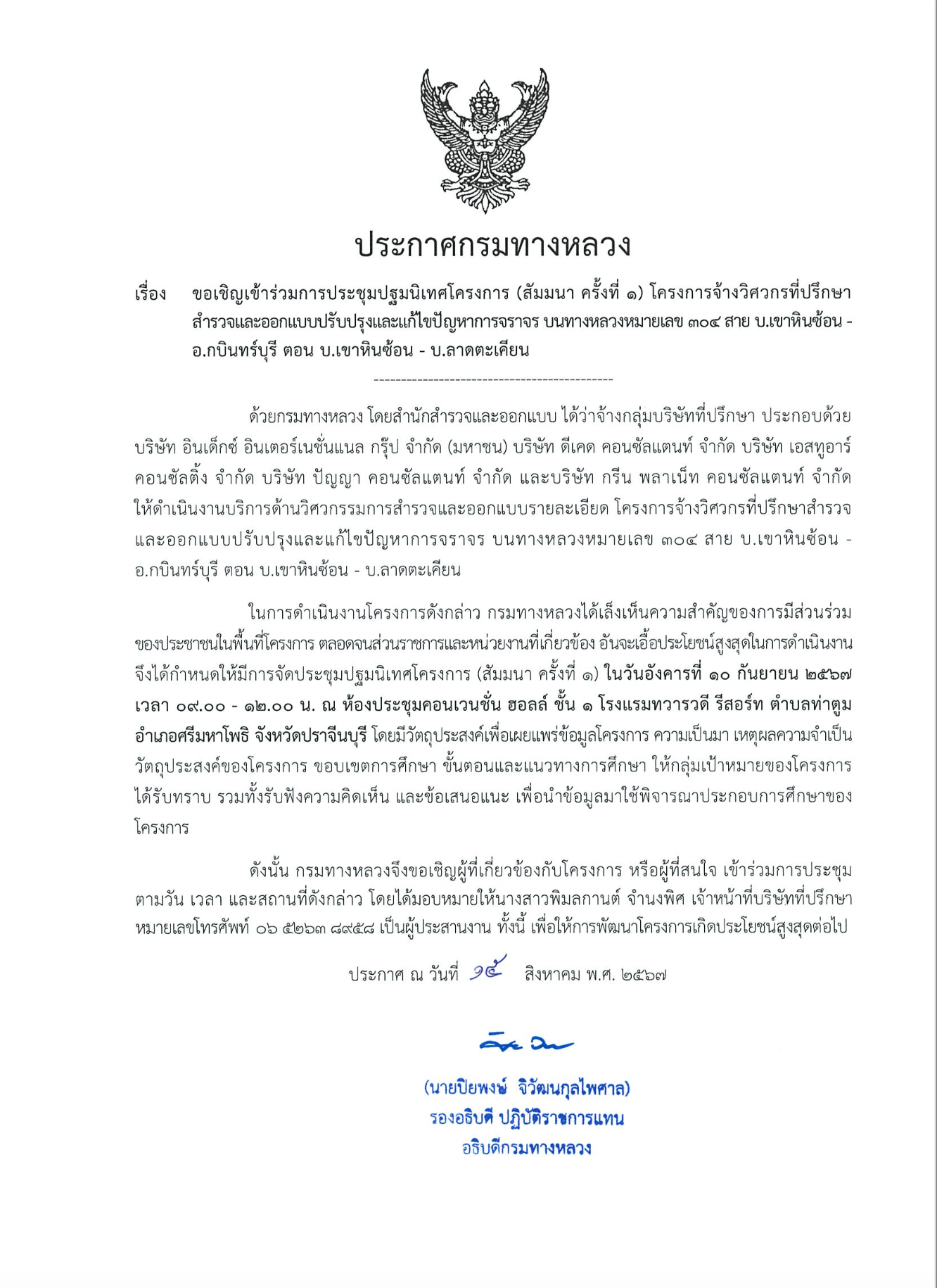 โครงการจ้างวิศวกรที่ปรึกษาสำรวจและออกแบบปรับปรุงและแก้ไขปัญหาการจราจร บนทางหลวงหมายเลข 304 สาย บ.เขาหินซ้อน – อ.กบินทร์บุรี ตอน บ.เขาหินซ้อน – บ.ลาดตะเคียน ขอเชิญผู้สนใจเข้าร่วมการประชุมปฐมนิเทศโครงการ (สัมมนา ครั้งที่ 1) โดยมีวัตถุประสงค์เพื่อนำเสนอข้อมูลข่าวสารของโครงการ ประกอบด้วย ความเป็นมา วัตถุประสงค์ของโครงการ พื้นที่ศึกษา ขอบเขตการศึกษา ขั้นตอนและแนวทางการศึกษา ให้กลุ่มเป้าหมายที่เกี่ยวข้องได้รับทราบ และเพื่อรับฟังข้อคิดเห็น ข้อเสนอแนะ และความต้องการของกลุ่มเป้าหมายที่เกี่ยวข้องมาใช้พิจารณาประกอบการศึกษาในด้านต่าง ๆ ของโครงการอย่างเหมาะสม โดยจัดประชุม ในวันอังคารที่ 10 กันยายน 2567 เวลา 09.00 – 12.00 น. ณ ห้องประชุมคอนเวอร์ชั่น ฮอลล์ ชั้น 1 โรงแรมทวารวดี รีสอร์ท ตำบลท่าตูม อำเภอศรีมหาโพธิ จังหวัดปราจีนบุรี